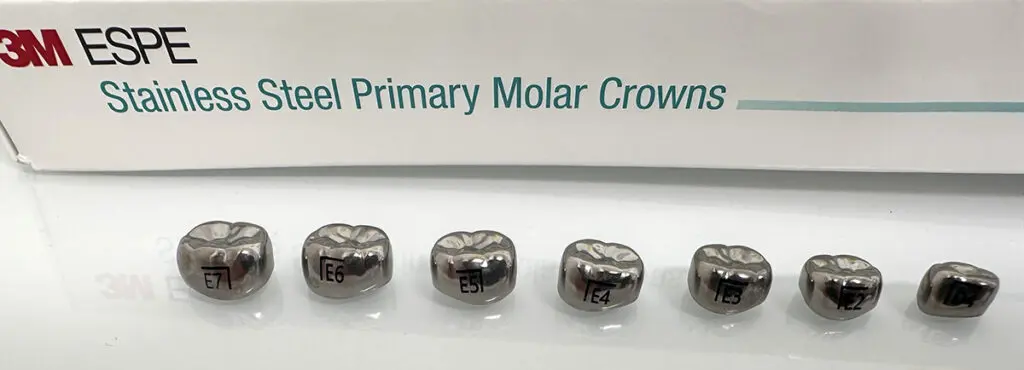 Korony stalowe to najszczelniejszy, najbardziej anatomiczny i korzystny dla pacjenta sposób odbudowy mocno zniszczonego zęba mlecznego. Korony są prefabrykowane, czyli mają różny kształt dla każdego mleczaka i występują w wielu rozmiarach. Powierzchnia żująca idealnie odwzorowuje anatomię zdrowego zęba. Po dobraniu odpowiedniej korony możemy ją przyciąć i dogiąć do kształtu zęba i przebiegu dziąsła.