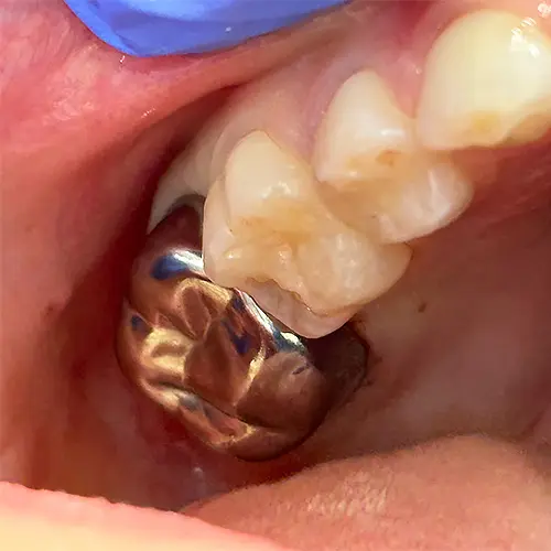 Poniżej przedstawiam zdjęcia zniszczonego i pokruszonego zęba (stała górna szóstka z zaawansowaną zmianą MIH), na który została założona korona stalowa.